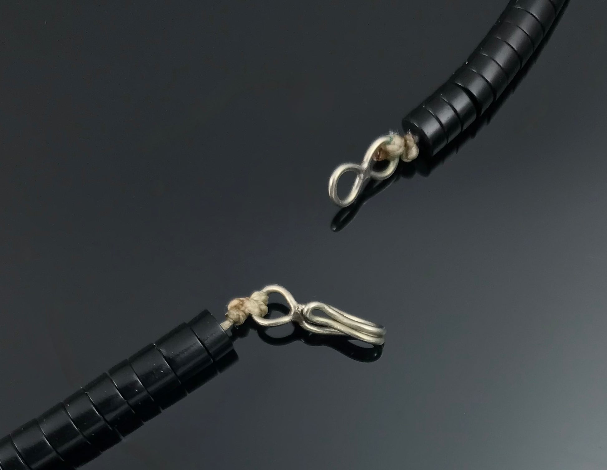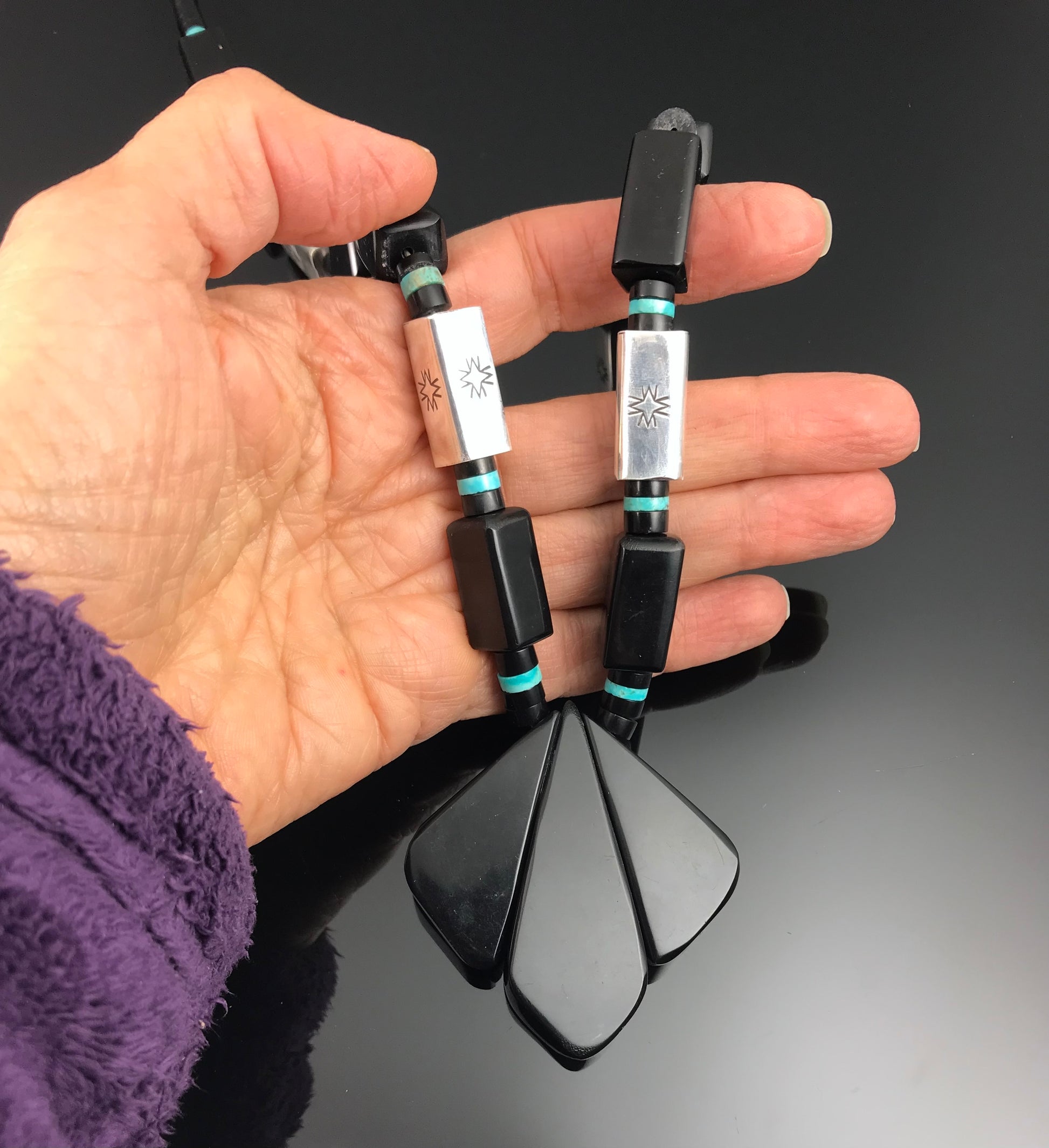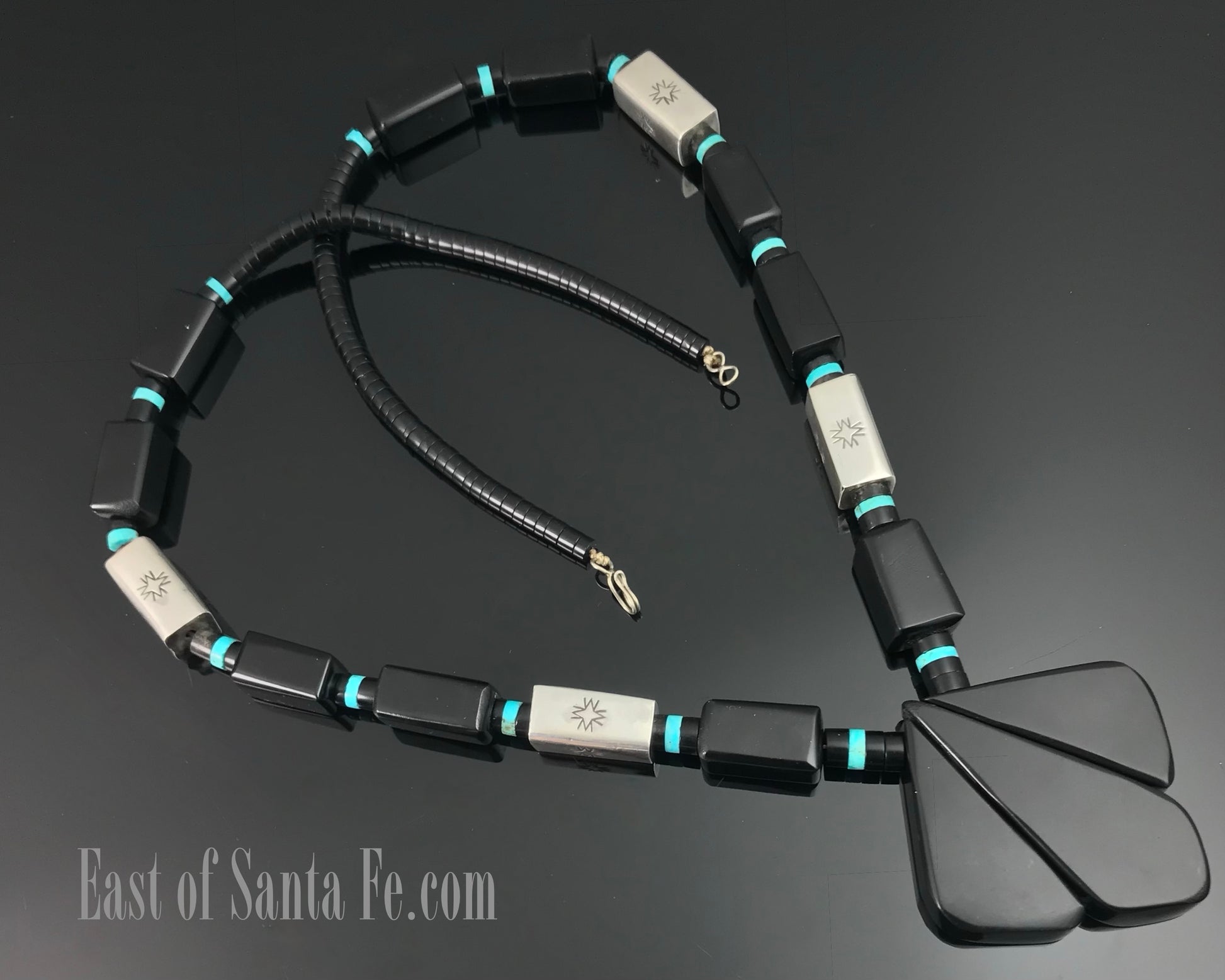 This is an amazing Santo Domingo necklace! The black jet beads are hand carved and separated by sterling beads and turquoise disks. The focal point is three large slabs of jet and it just lays beautifully on. This is truly a one-of-a-kind necklace! It is all original, including the string, which seems to be strong and in good condition with a classic hook and figure 8.