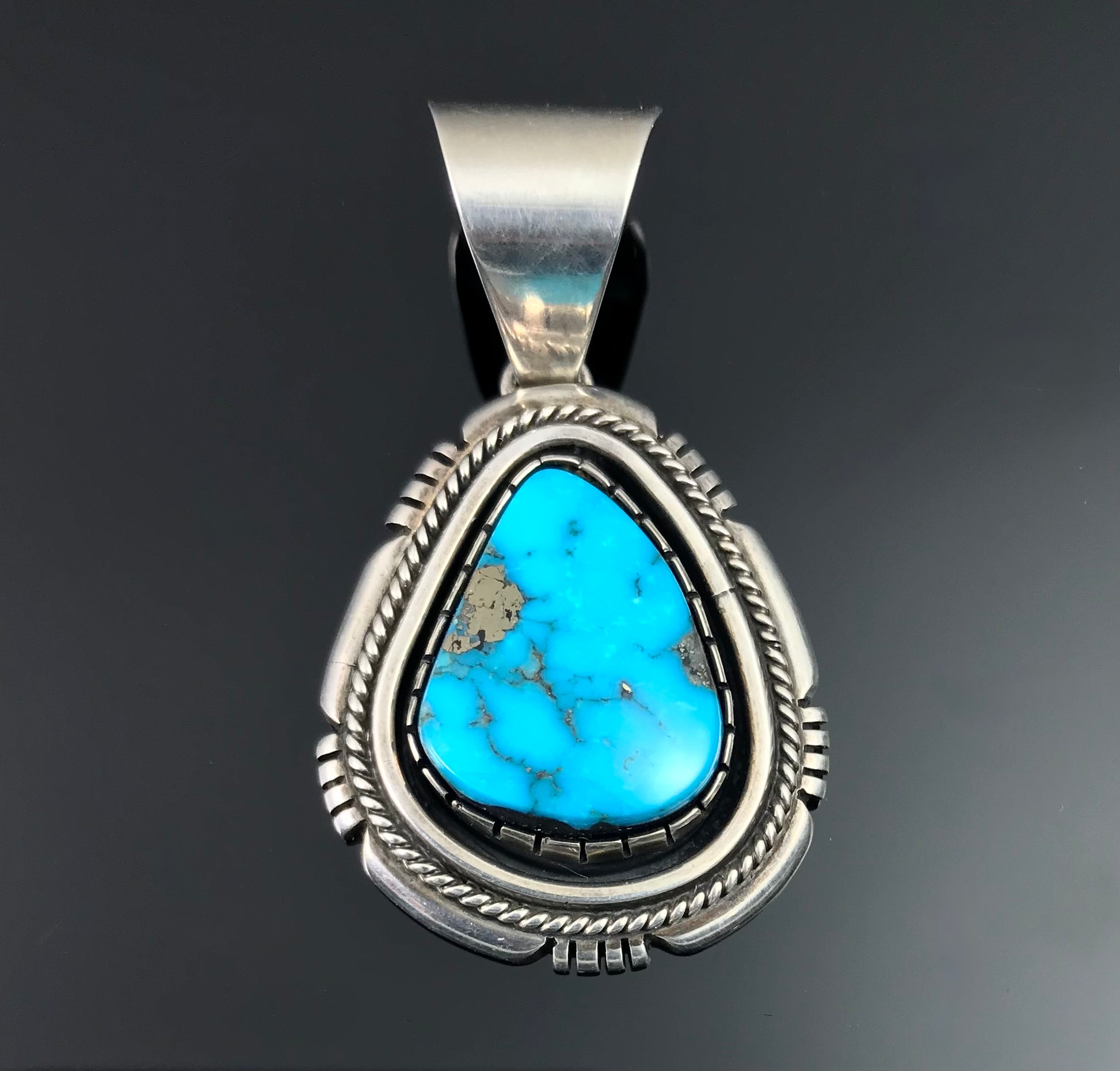 This gorgeous turquoise is from the Morenci mine in Arizona. Morenci is known for it's intense blue color and shiny iron pyrite. The mine closed in 1984 and the turquoise is highly collectible. This stone is particularly beautiful and the pendant was made by Delbert Vandever who comes from a family of top silversmiths. His work is impeccably done with fine attention to detail. He has won many jewelry awards, including a best of show at the Santa Fe Indian Market. Signed Delbert Vandever (Navajo) and sterling.