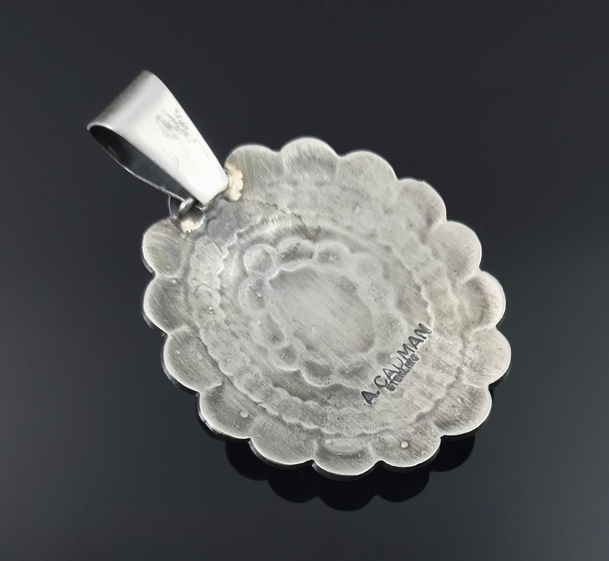 This is an opportunity to own one of Andy Cadman's incredible pendants. Andy is brother to Darrel Cadman and half brother Gary, Sunshine, and David Reeves. The brothers are known for their precise stamp work, top quality turquoise and heavy gauge sterling. Andy has won numerous awards for his work and this pendant is an example of his dedication to Navajo traditional design. The turquoise in this pendant is from the Fox Mine is Nevada with a rich blue green color and a lacey matrix. Signed A Cadman and sterling.