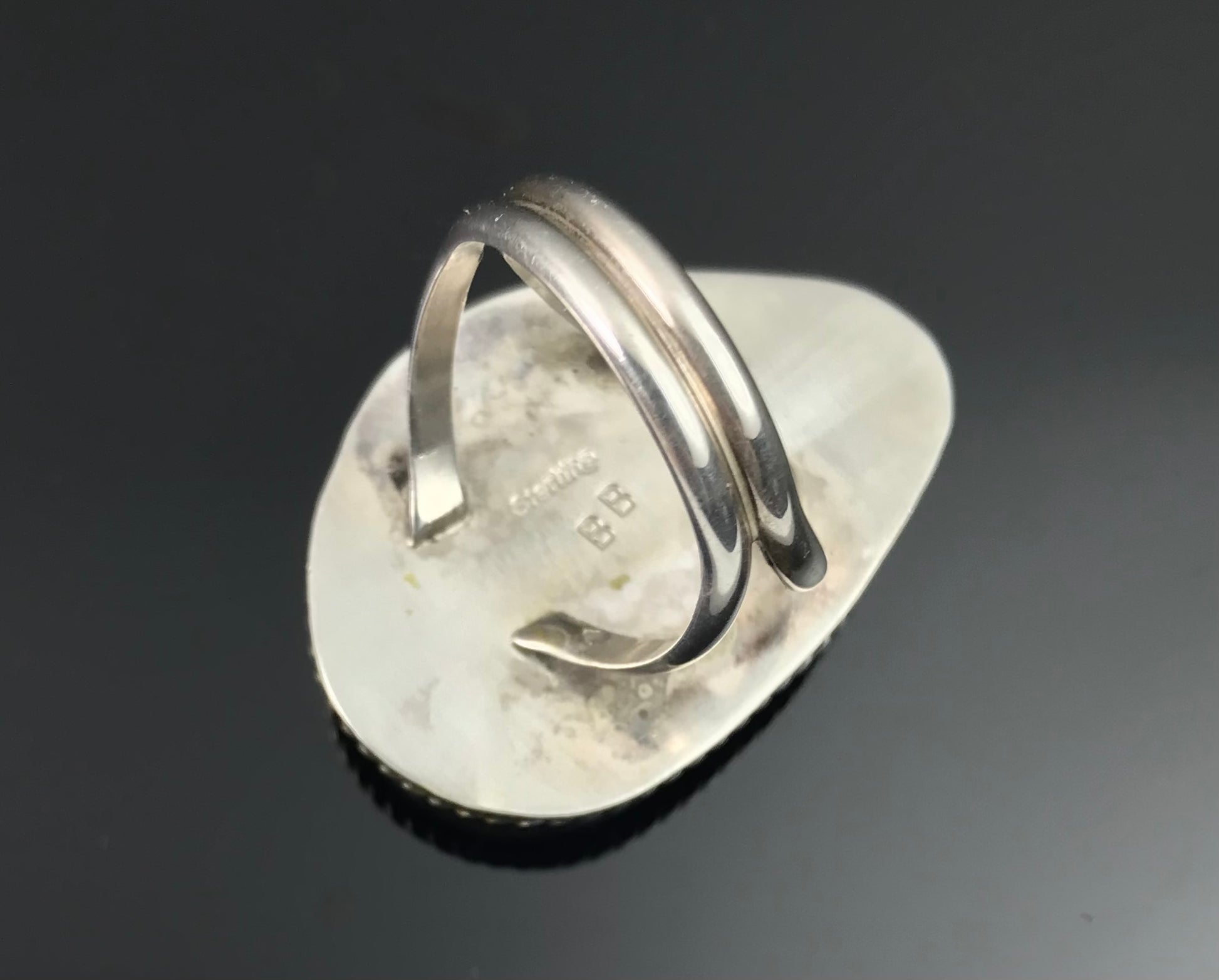 This is just one gorgeous turquoise! It's a beautiful mix of blues and greens, with a warm matrix. The setting as a single heavy rope frame to simply enhance the stone. Signed on the back BB (Benny Benally, Navajo) and sterling.