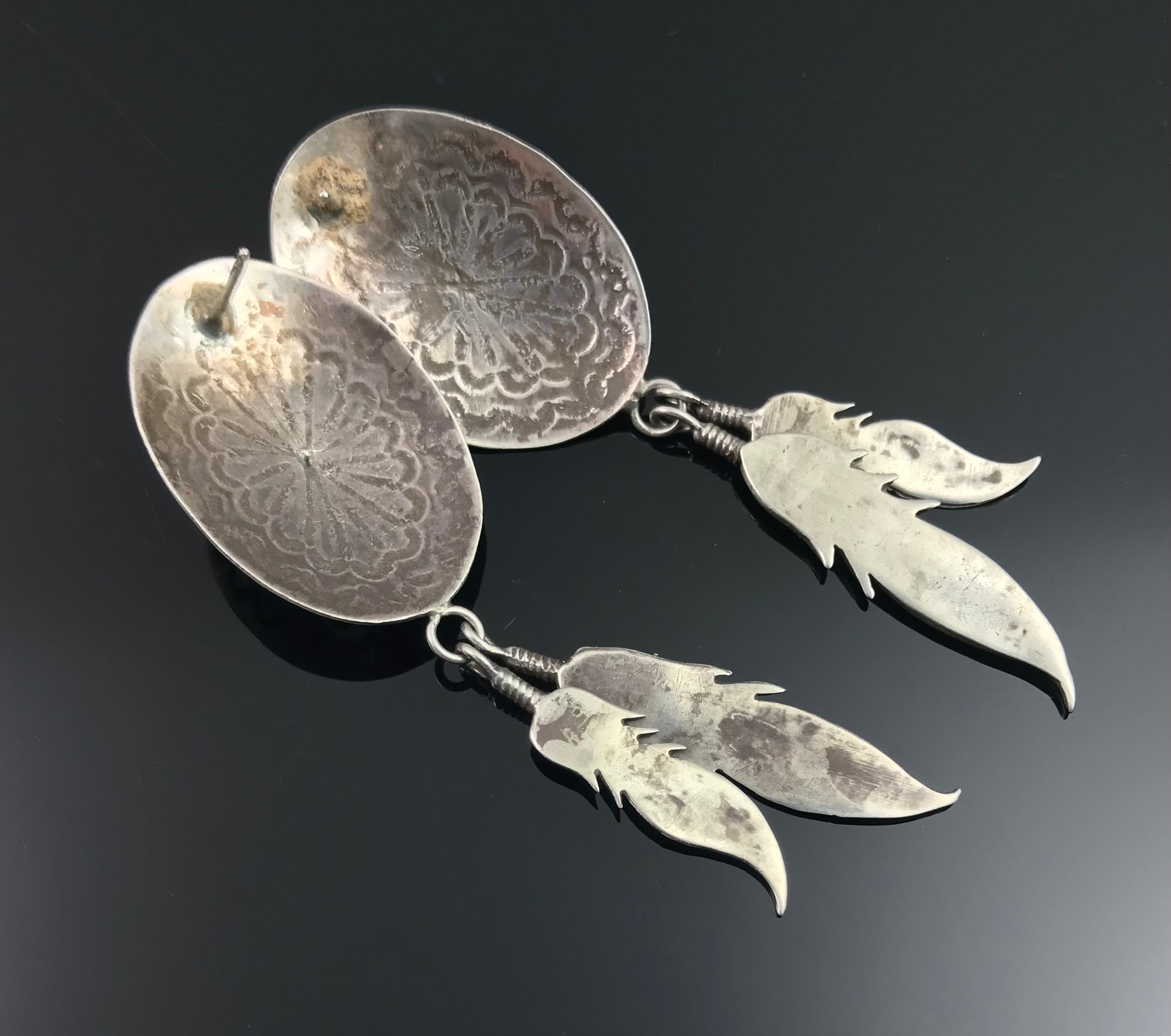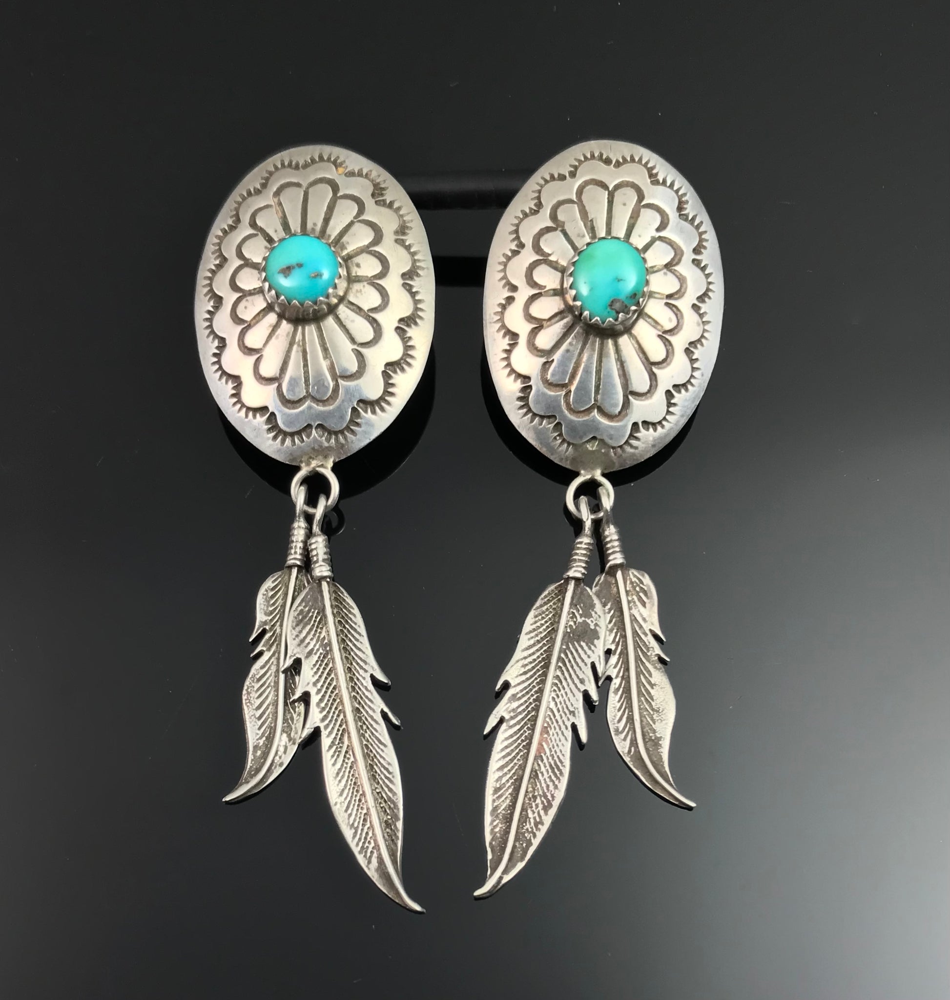 These earrings are a classic combination of conchos and feathers. The conchos are hand stamped and have a bright blue turquoise. They each have two hanging feathers. These are vintage and are unmarked.