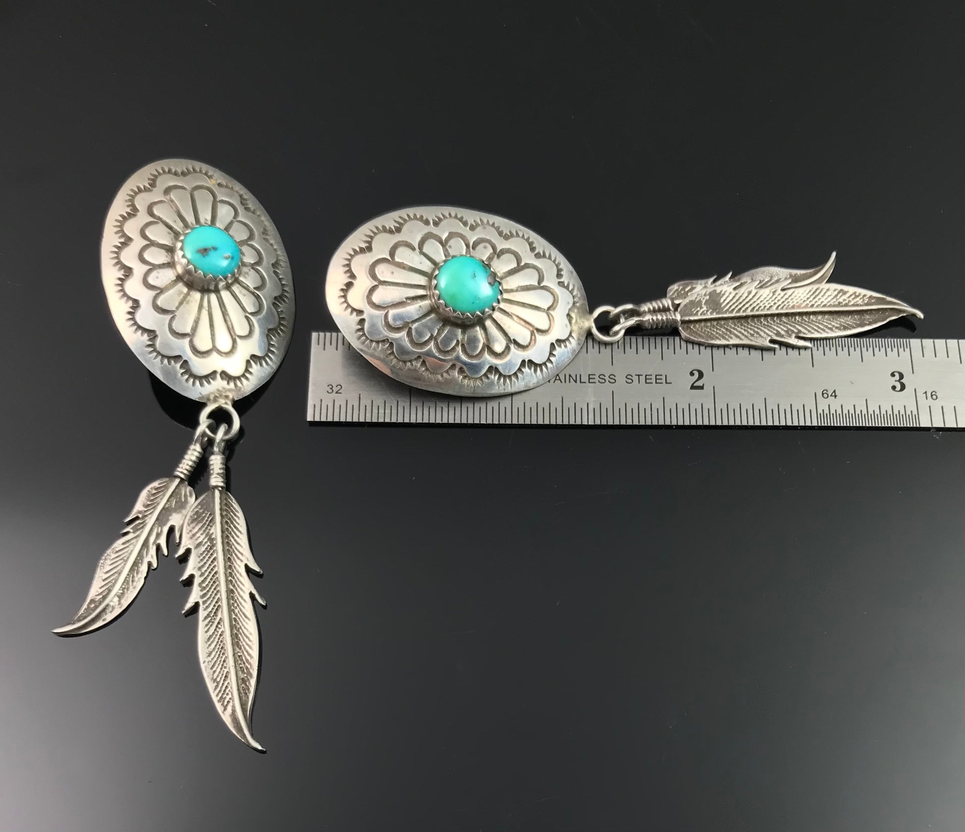 Turquoise Concho and Feather Earrings Native American Navajo - Vintage