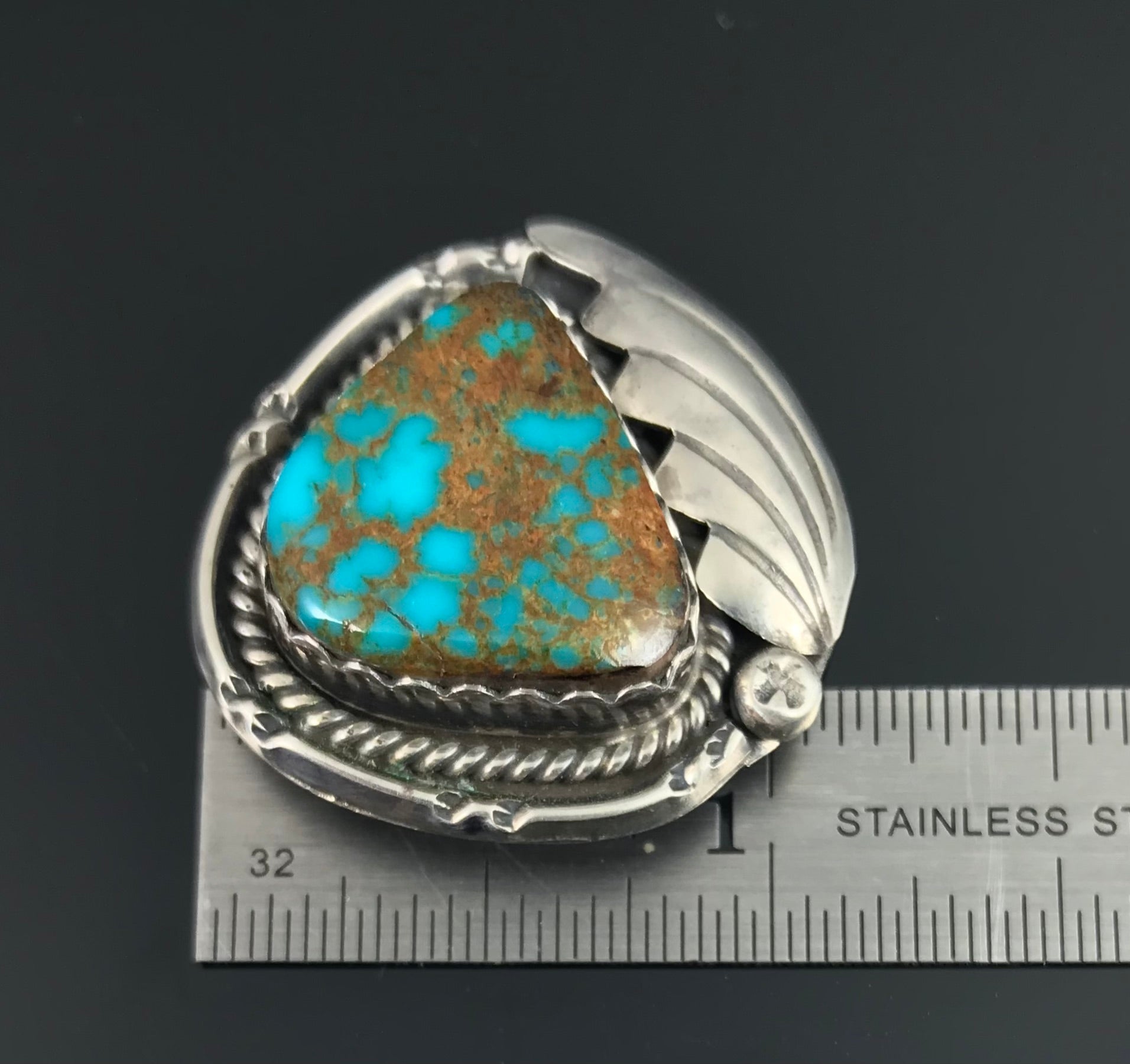 This is a beautiful, vintage pin pendant. The turquoise in this pin is just an incredible stone in the richest blue green color with a caramel colored matrix. There is both a bail and a pin to give the option to wear it either way. Signed Platerofne (Fanny Chavez Platero, Navajo)
