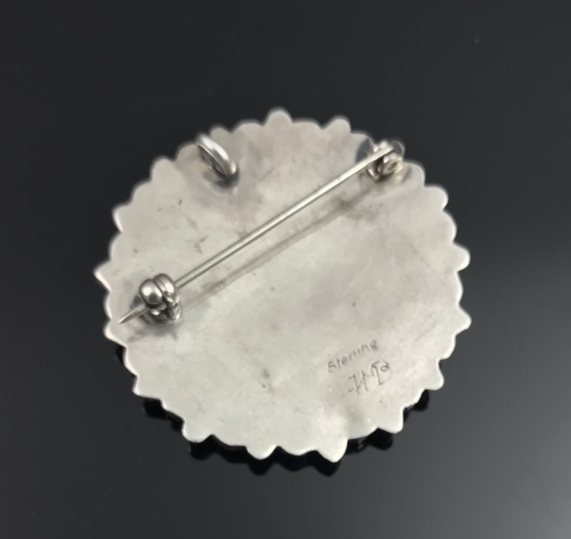 This turquoise cluster pin is truly a classic of Native American jewelry, traditionally worn by both the Navajo and the Zuni. The color is an unusual combination of green turquoise in a mix of round and pear shapes. There is a small bail that would a accommodate a thin chain giving it the versatility to be worn as either a pin or a pendant. Signed on the back HB and sterling.